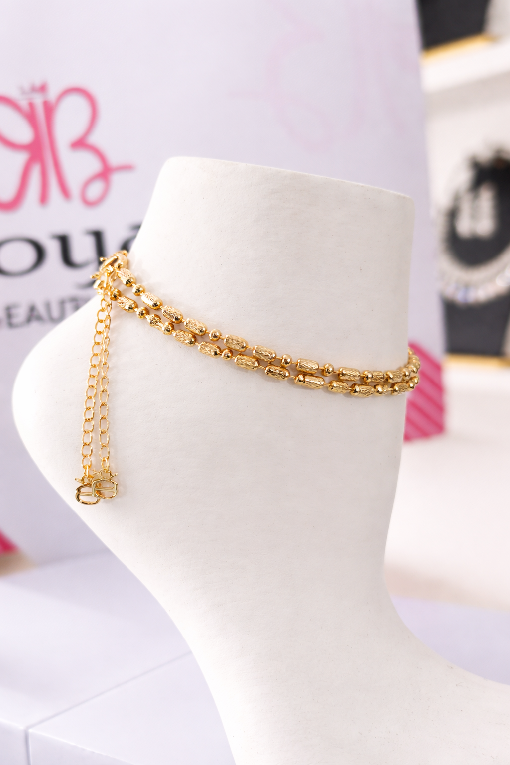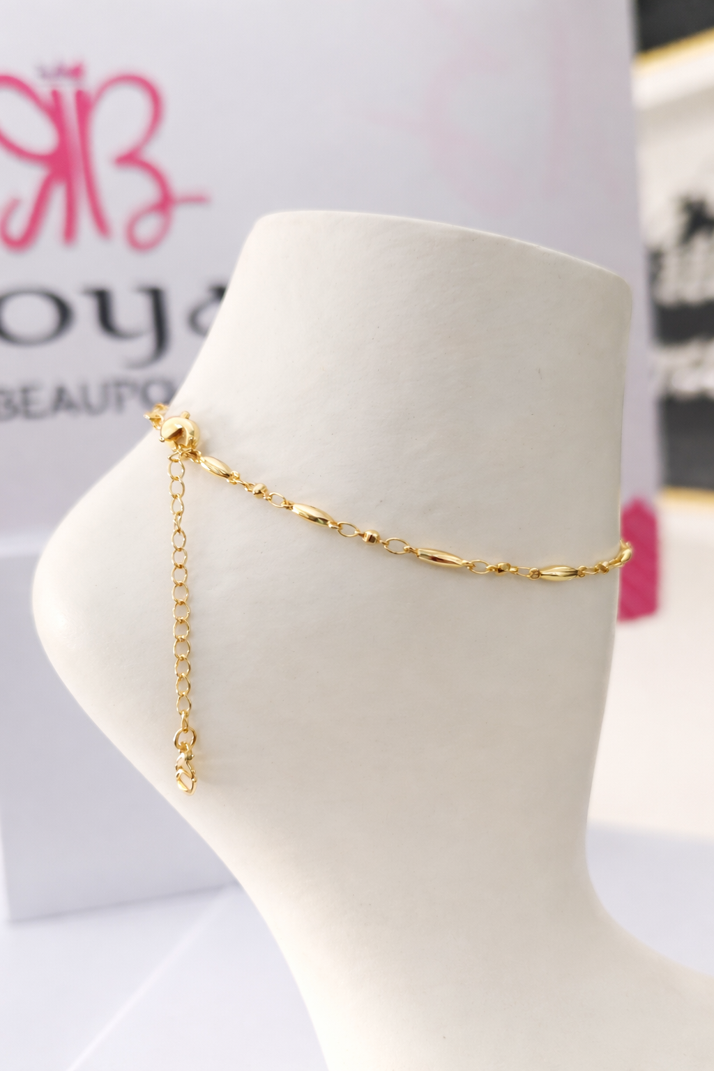Gold Double Layer Beaded anklets – Textured Barrel Bead Adjustable Chain
