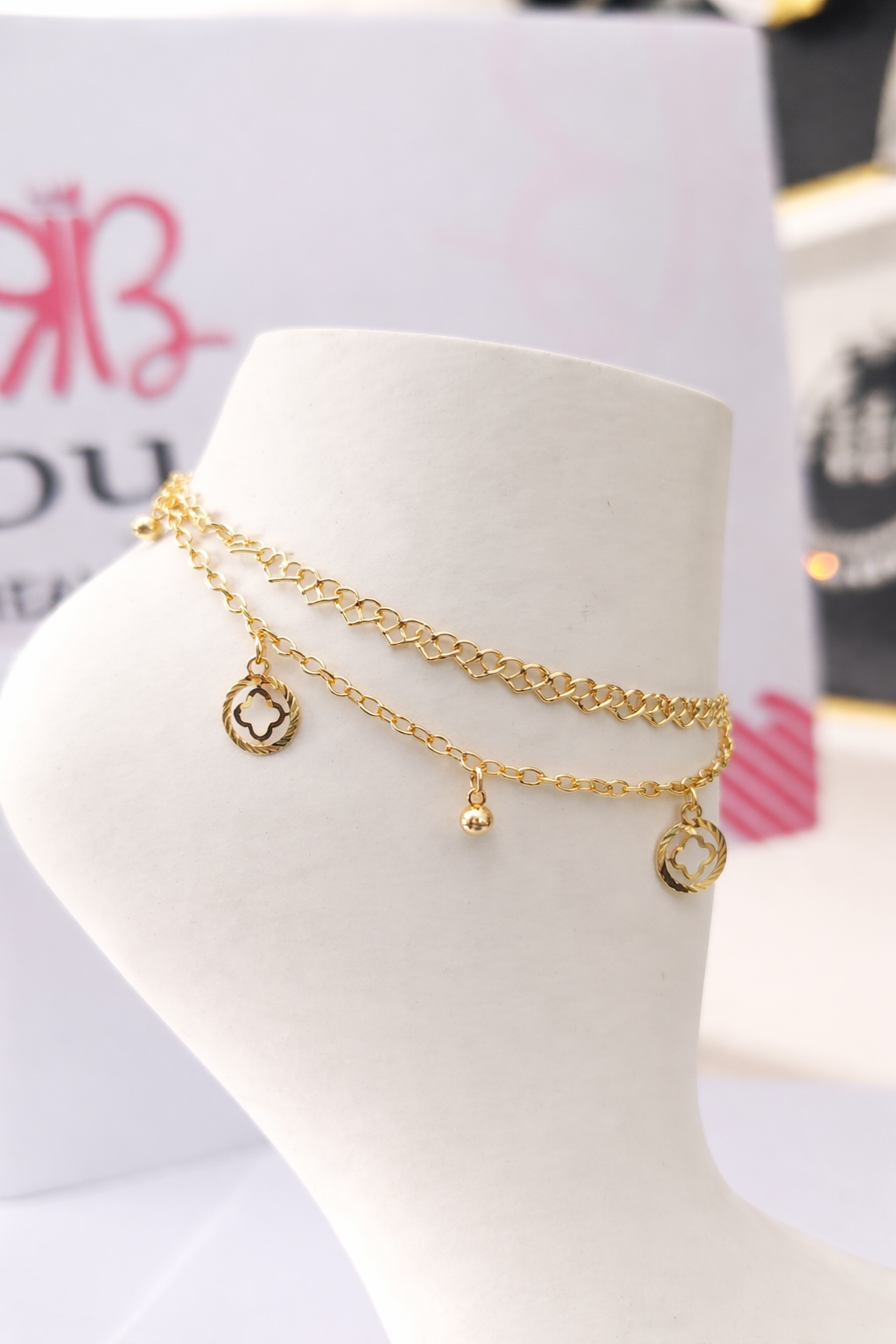 Layered Gold Charm Anklet Bracelet with Clover Charms and Adjustable Chain